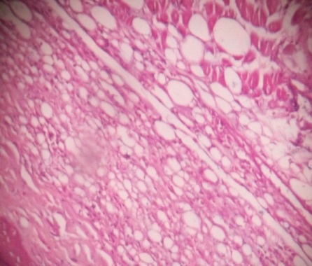 | Fig. 4: Histopathology slides-Ankle joint of the Indomethacin treated animals | Fig. 5: Histopathology slides-Ankle joint of the Rasa Mezhugu treated animals |