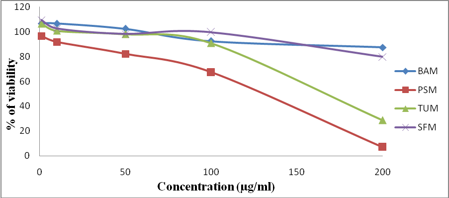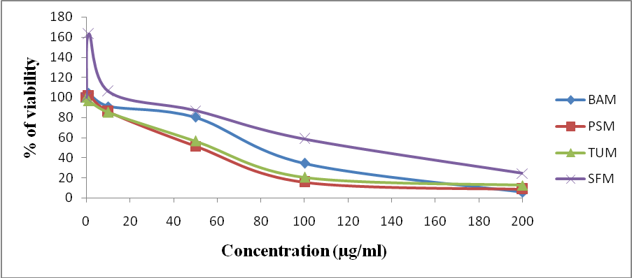 The selected plant extracts showed the dose-dependent cytotoxicity activity on the tested cell lines (fig. 1, 2). The cytotoxicity variations on different cell lines were observed for selected plants extracts. The IC50 values are showed in table 1. The cytotoxicity of the extracts was increased as the concentration of them was increased. The selected plants B. axillaris, T. ulignosa, P. semierectus and S. fruticosa have been using by people around the southern parts of the India for treating the diseases [7, 8].