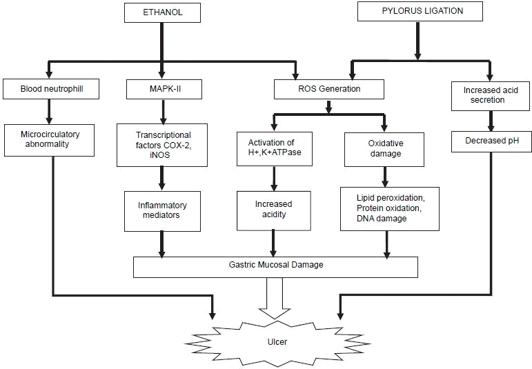 The reactive oxygen species deactivated the proton pump of H+K+ATPase, which lead to the release of acid gastric. Increasing of gastric acid can be booster by H-2 (Histamine-2). The intracellular mitogen-activated protein kinase (MAPK) causing the activation of NF-kb, modulate the molecules which have a role in the immune and inflammation system, such as IL-1β, IL-2, IL-6, IL-8, IL-12, iNOS and COX-2 [12].