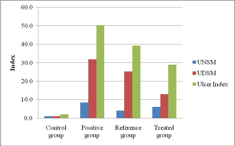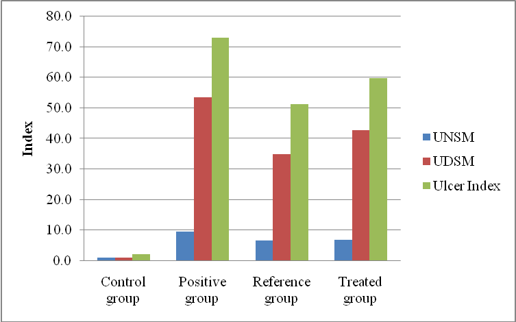 Fig. 5: The comparison of UNSM, UDSM, and Ulcer index of all groups (at the third-day treatment)