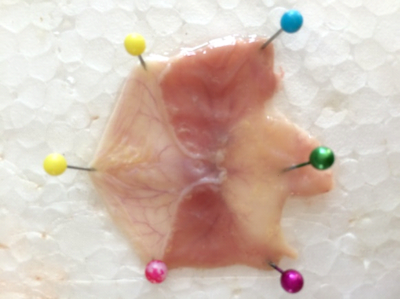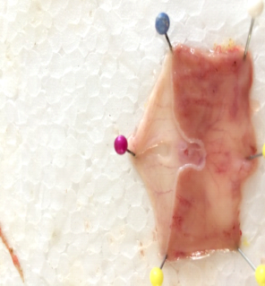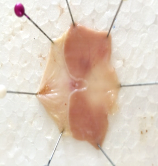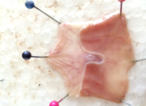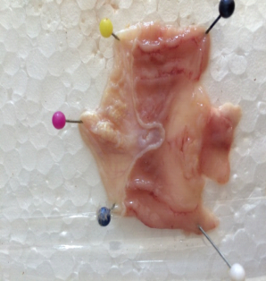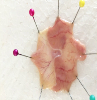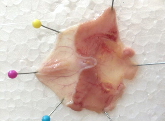 The animals were dissected and the stomach was taken out. This specimen was soaked with 10 ml 0,5% formaldehyde during 10 min, then cut off and washed by normal saline. The stomach was opened along the greater curvature and the mucosa was exposing for evaluation [7].