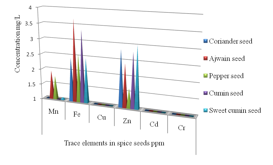 Results: Analysed trace mineral contents of these spice plants resulted highest level of Manganese is 1.92 ppm, Ferrous is 3.69 ppm and in Chromium is 0.0980 ppm in Ajwain seeds, Copper is 0.42 ppm in Coriander seeds, Zinc is 3.02 ppm and Cadmium is 0.0070 ppm in Sweet cumin seeds and lowest were found Mn is 0.65 ppm, Fe is 2.43 ppm in Coriander seeds, Cu is 0.15 ppm in Cumin seeds, Zn is 1.64 ppm in Pepper seeds, Cd is 0.0018 in Ajwain seeds and Cr is 0.0669 ppm in Sweet cumin seeds were studied in (n=3 ppm) all the sample selected spice seeds by AAS and suggests that the monitoring of trace elements in these medicinal plants does not exceed the limiting values set by World Health Organization to use it as a medicinal application.