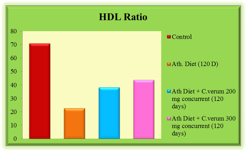 Fig. 1 illustrated that HDL ratio reduced significantly by-68.17% in rabbits after 120 d atherodiet feeding in comparison with controls. Further HDL ratio significantly improved in a dose-dependent manner after concurrent administration of C. verum extract as indicated in fig. 1.