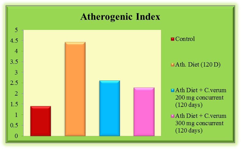 A significant rise of 214.18% was observed in the atherogenic index after 120 d of athero diet feeding. An ameliorative action of plant extract on the atherogenic index (i. e-40.85% at 200 mg and-48.53% at 300 mg dose level of C. verum crude extract was observed in the concurrent group when compared with group II. (fig. 2)