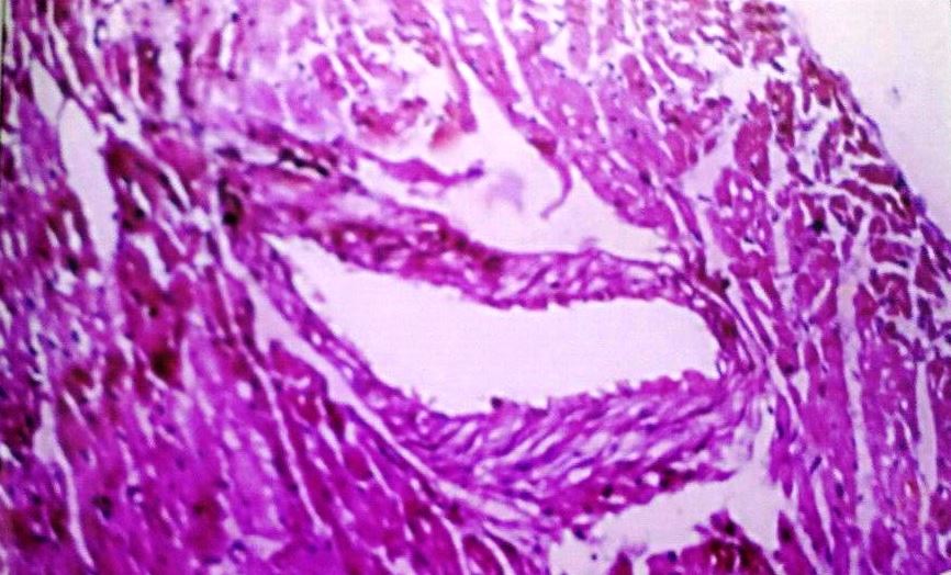 Heart and aorta (2–3 cm length) were quickly removed, cleared off the fat and connective tissue weighed on an electronic balance. A small section of heart and aorta of each animal was soaked in a 10 % (v/v) formocalcium solution for H and E staining. The heart and aorta were processed for the normal histological section. The tissue samples were ultra-sectioned (5–6 μm thickness), stained with haematoxylin and eosin (HandE) and examined under a light microscope for observation of structural abnormality.