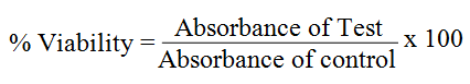 The cell culture suspension was washed with 1xPBS and then added with 200μl MTT solution to THE culture (MTT-5 mg/volume dissolved in PBS). Then incubate 370C for 3 h. Remove all MTT wash with 1xPBS and add 300μl DMSO to each culture. Incubate at room temperature for 30 mts until the cell get lysed, and the colour is obtained. The solution was transferred to centrifuge tubes and centrifuged at top speed for 2 mts to precipitate cell debris. OD was read at 540 nm using DMSO as blank. The Percentage Viability was calculated using the formula below: