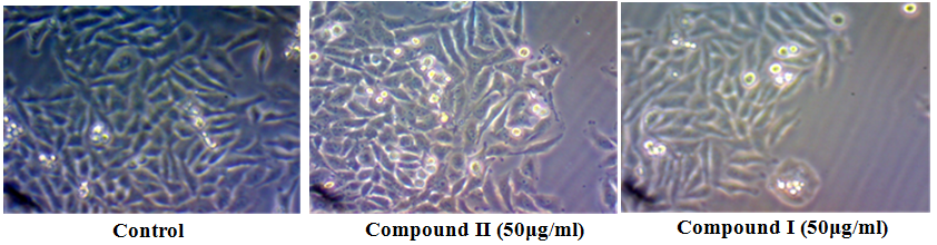 The in vitro cytotoxicity activity was carried out by MTT assay. From the table 1.1 and 1.2 it showed the percentage viability of HCT 15 cell line is 54-67 which is most suitable to perform cytotoxicity studies. The effect of compound I and II on the growth of HCT15 cells were tested under in vitro conditions using different concentrations (10μg/ml, 50μg/ml) was given in table 1.1. Compound I (50μg/ml) exhibited significant cytotoxic activity (67.18%) compared than Compound II. Compound II exhibited (57.71%) on HCT 15 cell line.
