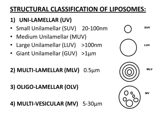 The liposomes vary in size ranging from 20 nm to 30 µm vesicles. Moreover, liposomes can single layered or bilayered. The vesicle size is an acute parameter for calculating the circulation half-life of liposomes. Besides, size, as well as number of bilayers, affects the amount of drug entrapped in the liposomes. On the basis of their size and number of bilayers, liposomes can also be classified into one of three categories: