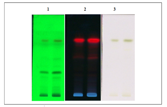 Fig. 2: HPTLC profiles of iridoid glycoside from the ethanol extract of Myxopyrum smilacifolium Blume. Illuminations type: 1. 254 nm remission, 2. 366 nm remission, 3. white remission