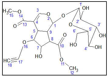 The phytochemical investigation was performed with Myxopyrum smilacifolium Blume. This showed the presence of an iridoide nucleus. Their structure was established on the basis of spectroscopic evidence, and the proposed structure is given below. Based on the physical and spectroscopic examination the compound may be an iridoid glycoside.