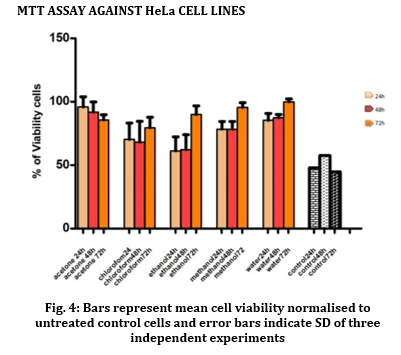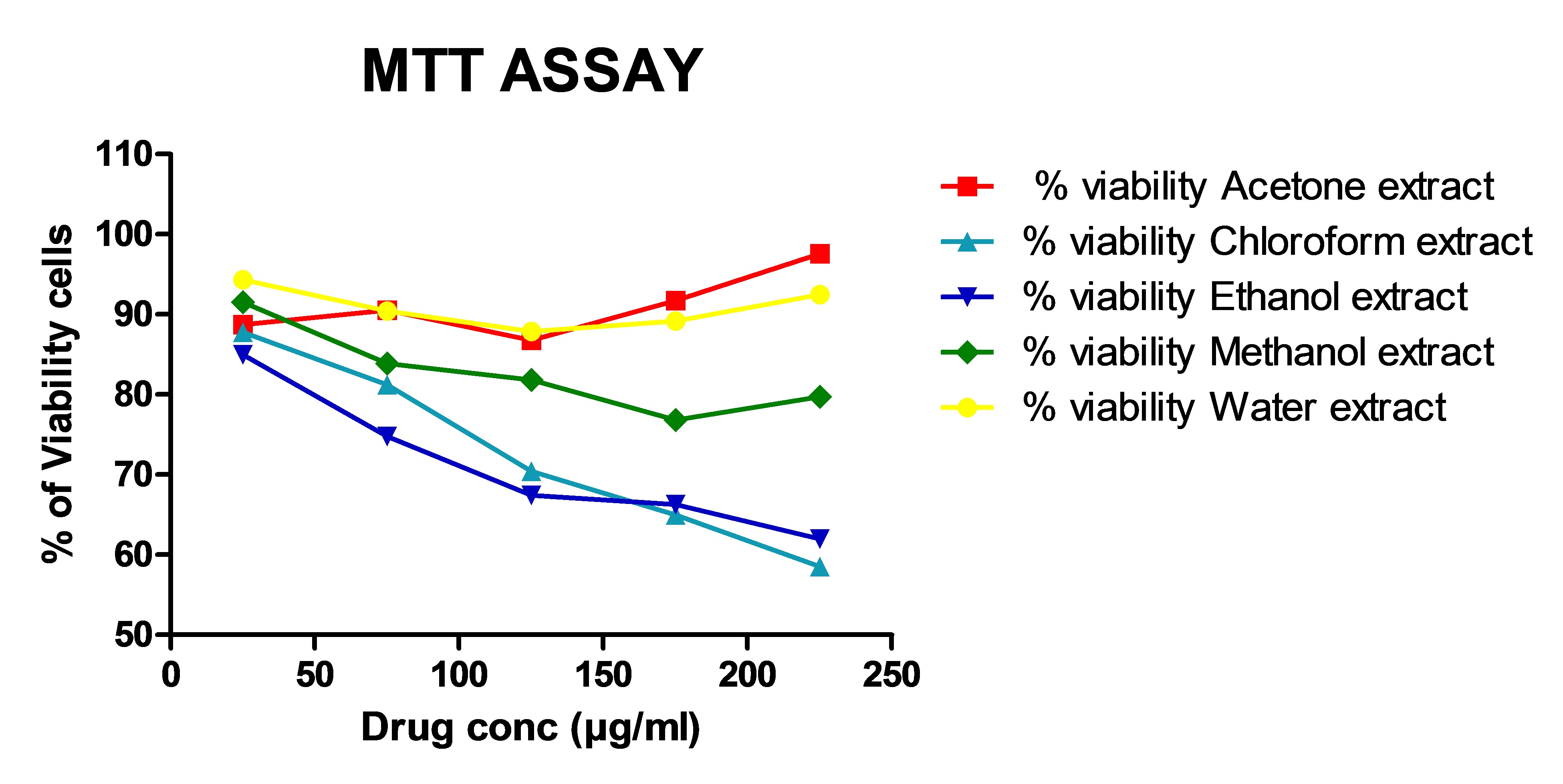 In vitro assay for cytotoxic activity of investigated extract was performed when the cells reached 70–80% of confluence [17]. A stock solution of the extract was dissolved in the corresponding medium to the required working concentrations.200μl cell suspension was seeded in a 96-well plate at required cell density (20,000 cells per well), without the test agent. The cells were allowed to grow for about 12 h. Then, cells were incubated in the presence of various concentrations of the samples (50, 100, 150, 200, 250 µg/ml) for 24hours, 48hours and 72hours at 37 °C in 5% CO2 atmosphere. The effect on cancer cell survival was determined 24hours, 48hours and72 h after the addition of extract, by the MTT test. Standard drug Berberine was used as a positive control.