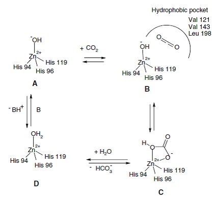 The Zn (II) ion of CAs is essential for catalysis. X-ray crystallographic data showed that the metal ion is coordinated by three histamine residues (His 94, His 96, and His 119) and a water molecule/ hydroxide ion. The zinc bound water is also engaged in hydrogen bond interactions with the hydroxyl moiety of Thr 199, which in turn is bridged to the carboxylate moiety of Glu 106; these interactions enhance the nucleophilicity of the zinc-bound water molecule, and orient the substrate (CO2) in a favorable location for the nucleophillic attack.
