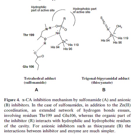 Two main classes of CA inhibitors are known: the metal complexing anions and the un-substituted sulfonamides, which bind to Zn (II) ion of the enzyme either by substituting the non-protein zinc ligand or add to the metal coordination sphere, generating trigonal-bipyrimidal species. Sulfonamides, which are the most important CAIs bind in tetrahedral geometry of the Zn (II) ion, in deprotonated state, with the nitrogen atom of the sulfonamide moiety coordinated to Zn (II) and an extended network of hydrogen bonds, involving residues Thr199 and Glu 106, also participating to the anchoring of the inhibitor molecule to the metal ion. The aromatic/heterocyclic part of the inhibitor interacts with hydrophilic and hydrophobic residues of the cavity [3, 4]. Anions may bind either in tetrahedral geometry of the metal ion or as trigonal-bipyramidal adducts, such as for instance the thiocyanate adduct as shown in fig.