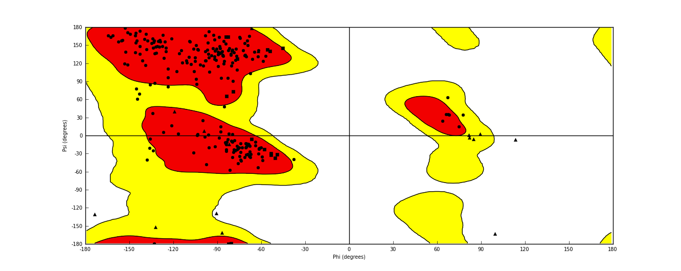Ramachandran Plot: The Ramachandran Plot panel displays a plot of the dihedral angles φ and ψ for each residue in the protein that is displayed in the Workspace. The plot area displays a plot of protein dihedrals for all residues in the protein. The darkest area “red region” corresponds to “core” region representing the most favorable combinations. Ideally 90% of the residues should be in this “core” region.