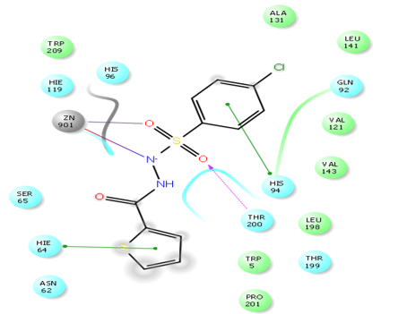 Docking of the standard compound showed the presence of very strong binding affinity for the active site of CAXII. The nitrogen of sulfonamide functional group is in coordination with the zinc ion of the active site. Further, the interactions of the AZA are strengthened by hydrogen bonding with surrounding amino acid residues.