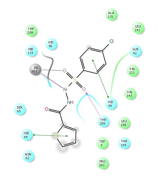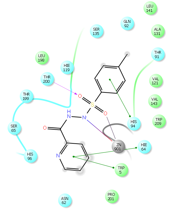 From the outcome of the literature survey, it was observed that sulfonamide functional group is essential for the binding to the active site of carbonic anhydrase which finally leads to its inhibition. Taking into consideration pharmacophore requirements of carbonic anhydrase, we have used the ligands designed by seniors which have sulfonamide group to carry out docking studies. These ligands are N’-(substituted phenyl sulfonyl)-thiophene-2-carbohydrazide derivatives and N’-(substituted phenyl sulfonyl)-pyridine-2-carbohydrazide derivatives.