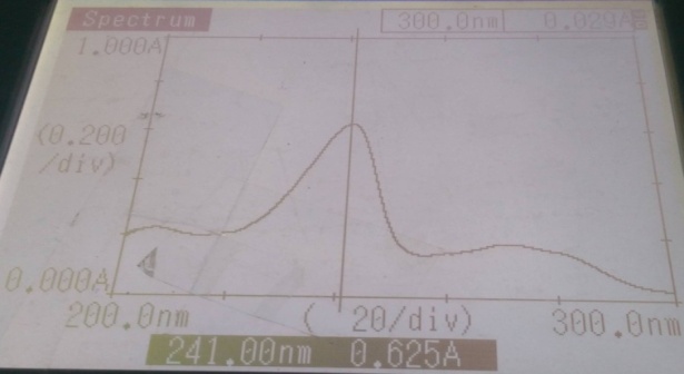 Method A: zero order spectroscopic methodThe wavelength was selected by preparing a solution of concentration 2.0 µg/ml by diluting the standard solution with methanol. The solution was scanned under spectrum mode over a wavelength range of 210-400 nm using methanol as blank. The UV spectrum showed λmax at 241 nm in methanol (fig. 2). The calibration curve was plotted taking absorbance on Y-axis against the concentration of standard solution on x-axis over a concentration range of 1-5 µg/ml (fig. 3). The regression equation was calculated.