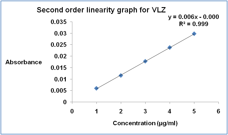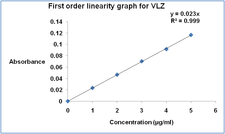 For the estimation of Vilazodone HCl in the commercial formulations, 20 tablets each containing 20 mg of Vilazodone HCl were weighed and the average weight was calculated. The tablets were crushed and powdered in a glass mortar. Powder equivalent to 10 mg of Vilazodone was transferred into a 10 ml volumetric flask and dissolved in sufficient quantity of methanol and sonicated. The final volume made up to the mark with methanol and the solution was filtered through whatman filter paper no.41. Further dilutions of the stock solution were made in methanol to get required concentration of 2 µg/ml. The concentration of Vilazodone HCl in the formulation was determined by above-developed methods. Results of tablet analysis are shown in table 1. The assay procedure was repeated six times (n= 6) for each method.4.0.0.6 Method validationThe methods were validated according to ICH guidelines [10] to study linearity, precision and accuracy.