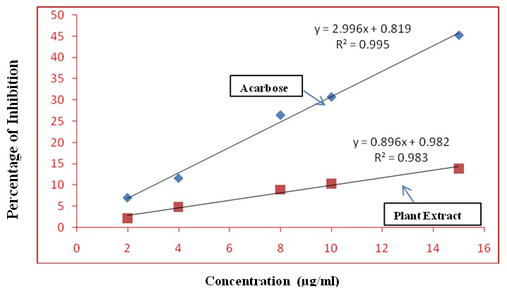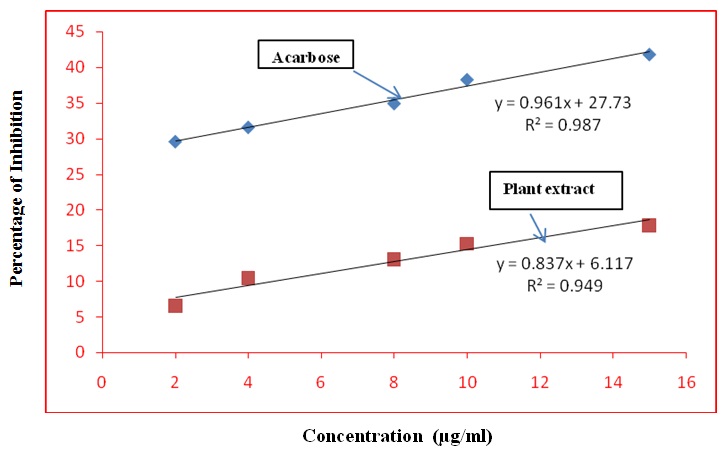 All experiments were performed in three different sets, each in triplicate. The data are expressed as mean±SEM (standard error of the mean). The statistical difference, ANOVA and linear regression analysis were performed using Graph pad prism 5 statistical software. The IC50 values were determined from plots of percent inhibition versus log inhibitor concentration and calculated by logarithmic regression analysis from the mean inhibitory values. The IC50 values were defined as the concentration of the extract, containing the α-amylase inhibitor that inhibited 50% of the alpha-amylase activity.