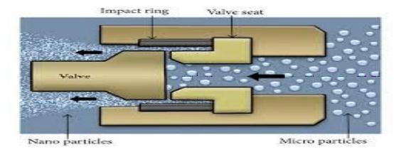 This method is based on cavitation principle. The dispersion present in 3 cm diameter cylinder is suddenly passed through a very narrow gap of 25μm. According to Bernoulli’s law, the flow volume of liquid in a closed system per cross section is constant. It leads to increase in dynamic pressure and decrease of static pressure below the boiling point of water at room temperature due to a reduction in diameter from 3 cm to 25μm. Then water starts boiling at room temperature and forms gas bubbles, which implode when the suspension leaves the gap (called cavitation) and normal air pressure is reached. The particles cavitation forces are sufficiently high to convert the drug microparticles into nanoparticles.