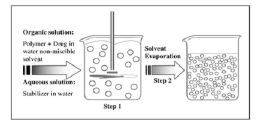 In the solvent evaporation method, the solutions of the polymer are prepared in volatile solvents and emulsions. The emulsion is converted into a nanoparticle suspension on evaporation of the solvent for the polymer, which is allowed to diffuse through the continuous phase of the emulsion. The particle size was influenced by the concentration of polymer, stabilizer and the speed of homogenizer. In the conventional methods, two main strategies are being used for the formation of emulsions, the preparation of single emulsions, e. g., oil-in-water (o/w) or double-emulsions, e. g., (water-in-oil)-in-water, (w/o)/w.
