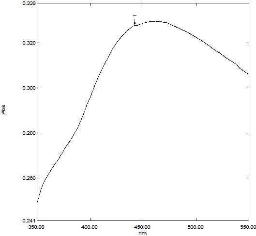 UV–vis spectroscopy technique was applied to monitor the SPR absorbance band of silver nanoparticles synthesized using leaf extract of Simaroubaglauca and it was centered at 440 nm and relentlessly increments in intensity as a function of the time of reaction without any shift in the peak wavelength (fig. 3) [21]. The frequency and width of the surface plasmon absorption relies on the size and shape of the metal nanoparticles and in addition on the dielectric constant of the metal itself and the encompassing medium.