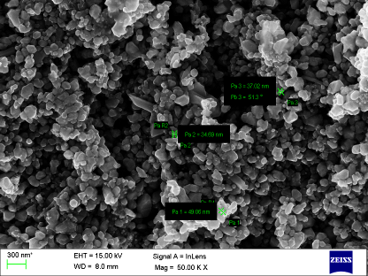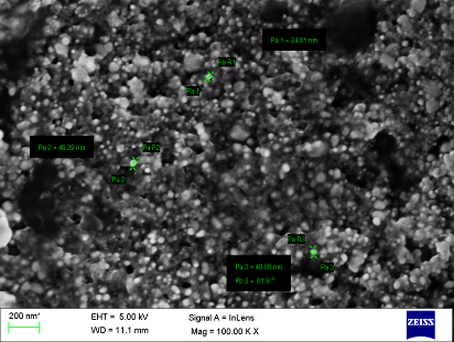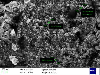 Size, shape and morphology of silver nanoparticles were resolved by scanning electron microscopy by using ZEISS Ultra 55 SEM machine operated 5 kVat Center for Nanoscience and Engineering, Indian Institute of Science, Bengaluru. A thin film of the sample was prepared on a carbon coated copper grid by just keeping the very small amount of the sample on the grid. The readings and photographic scan were taken at 50.00, 75.00 and 100.00 magnification with constant voltage and at different angles.