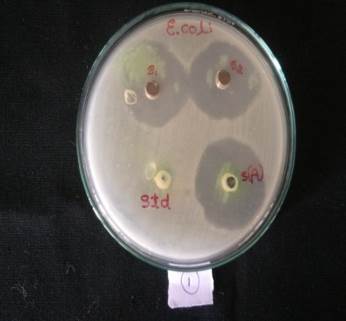 Fig. 7: Antibacterial activity of synthesized silver nanoparticles, S1-50 µg/ml. S2-100 µg/ml. Std–Distilled water. S(A)-Amphicillin