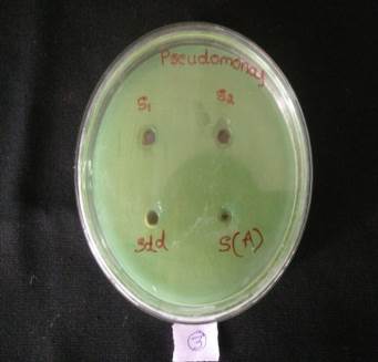The antimicrobial assay was carried out by Agar well diffusion method. Overnight samples were swabbed on the plates containing Muller Hinton Agar (MHA) medium (Hi-Media). Wells were prepared in the medium using sterile gel puncture.50µg/ml and 100µg/ml of synthesized silver nanoparticle solution was added to wells. Sterile distilled water and antibiotic amphicillin were added as negative and positive control respectively. Petri plates were kept for incubation for 24h at 37 °C.