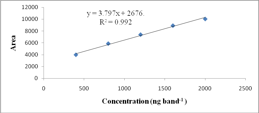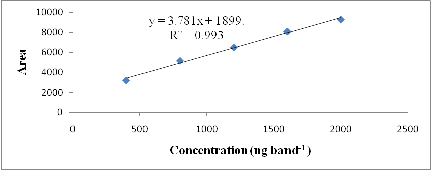 Linearity was evaluated in the range of 400-2000ng spot-1 for glycyrrhetic acid and solasodine. For the calibration curve accurately measured a standard stock solution of glycyrrhetic acid and solasodine (400, 800, 1200, 1600, 2000ng) were spotted on pre-coated TLC plate under nitrogen stream using Linomat V spotter. Then chromatographed and scanned as described above.