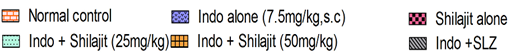 | Indo+Shilajit (50 mg/kg, p. o) | 3.975±0.1019*** | 1806±12.73*** | 3.630±0.2812*** |
