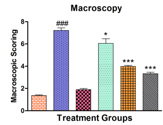 Drug treatment will be continued till 11th d. On the 12th d after treatment, animals were anaesthetized with ether and blood was collected by retro-orbital puncture. Later, the animals were sacrificed by cervical dislocation and dissected open to remove the ileum portion. Ileum was flushed gently with saline and cut open. Inflammation was assessed based on the macroscopic scores [7] and quantification of inflammation was done by the assay of serum Lactate Dehydrogenase [8] (LDH) and tissue Myeloperoxidase activity [9] (MPO), GSH [10] and LPO [11].