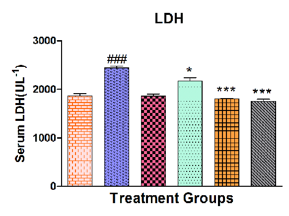 The shilajit and SLZ treated groups showed lower scores compared to Indo alone treated group. An elevation of LDH in serum indicates a shift towards anaerobiosis resulting in the enhanced production of lactic acid. In the present study, serum LDH levels were significantly elevated due to Indo administration compared to normal animals. Pre-treatment with shilajit and SLZ inhibited the elevation of serum LDH level.