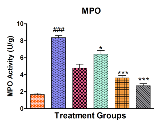 Values are expressed as mean±SEM, n=6. Values of Macroscopic Score are expressed as Points, while LDH is expressed as units/liter and MPO activity as U/g. ### p<0.001 significantly different from normal control group. * p<0.05, ** p<0.01 and ***p<0.001 significantly different from Indo group. One-way ANOVA followed by Tukey's post test