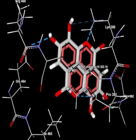 The top 5 ligands for the target p-glycoprotein are ellagic acid (-60.7406); gallic acid (-57.7957); Curcumene (-57.1762); Phyllemblin (-54.874); alpha-farnesene (-49.0781). The constituents of Phyllanthusemblica was found to have a moderate affinity to p-glycoprotein when compared to that of the standard, raltitrexed (-141.817) and tamoxifen (-115.666). Refer table 1.