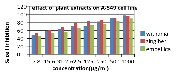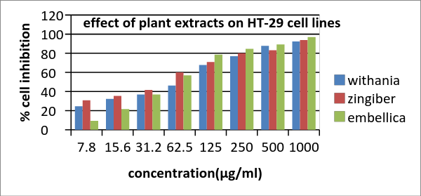 Screening of extracts of Withaniasomnifera, Phyllanthusemblica, Zingiberofficinale resulted in impotent anticancer activities against A-549, MCF-7 and HT-29 cell lines. The inhibitory properties of these extracts are compared with the standards, tamoxifen for MCF-7 and A549 cell lines and 5-flourouracil for the HT-29 cell. The percentage cancer cell inhibition profiles were found to be concentration dependent. The maximum concentration (μg/ml) used in the study was 1000μg/ml.