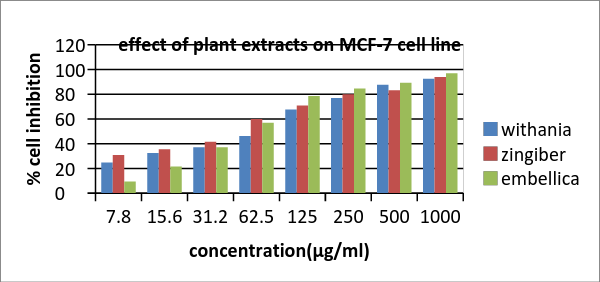 MCF-7 cell lines, when subjected to different concentrations of Phyllanthusemblica extract resulted in 87% inhibition at a concentration of 1000μg/ml. Similarly, Zingiberofficinale and Withaniasomnifera resulted in 83.9% and 82.4% of MCF-7 cell death respectively. On the other hand, comparison with tamoxifen showed that 95.6% MCF-7 cell line inhibition at the same tested dose (1000 μg/ml).