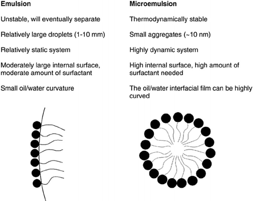 The oil component influences curvature by its ability to penetrate and hence swell the tail group region of the surfactant monolayer. Short chain oils penetrate the tail group region to a greater extent than long chain alkanes, and hence swell this region to a greater extent, resulting in increased negative curvature (and reduced effective HLB) [28]. Saturated (for example, lauric, myristic and capric acid) and unsaturated fatty acids (for example, oleic acid, linoleic acid and linolenic acid) have penetration enhancing a property of their own and they have been studied since a long time. Fatty acid esters such as ethyl or methyl esters of lauric, myristic and oleic acid have also been employed as the oil phase. Lipophilic drugs are preferably solubilized in o/w microemulsions. The main criterion for selecting the oil phase is that the drug should have high solubility in it. This will minimize the volume of the formulation to deliver the therapeutic dose of the drug in an encapsulated form.