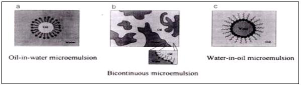 Fig. 7: Three most commonly encountered microemulsion microstructures, (a) oil-in-water, (b) bicontinuous, and (c) water-in-oil microemulsion