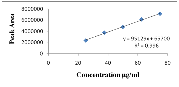 The linearity response was determined by preparing and injecting solutions with concentration about 25, 37.5, 50, 62.5 and 75µg/ml prepared from standard stock solution (100µg/ml) with mobile phase.
