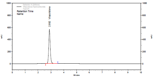 The standard stock solution of 1000µg/ml was prepared by dissolving 50 mg of Vilazodone Hydrochloride in 50 ml mobile phase. The standard stock solution of 100µg/ml was prepared by diluting 5 ml of standard stock solution (1000µg/ml) to 50 ml with mobile phase.