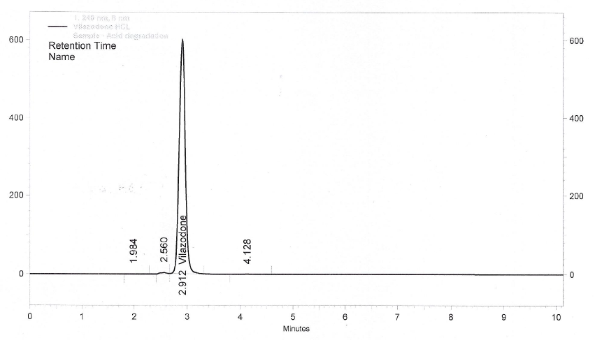 Conclusion: A simple, precise, rapid and accurate Stability Indicating HPLC method has been developed and validated for the determination of Vilazodone Hydrochloride in presence of its degradation products as per the ICH Guidelines.