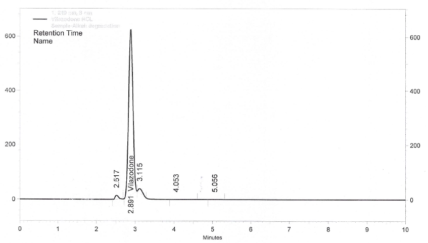Accurately weighed 10 mg of Vilazodone Hydrochloride was transferred to 100 ml volumetric flask. To the above 1 ml 1M NaOH was added and 25 ml mobile phase was added. The solution was refluxed for 1hour at 80-100 °C in water bath. After that, the solution was cooled and neutralised by 1 ml 1M HCl and the volume was made up to mark with the mobile phase. Dilute 5 ml of above solution with mobile phase up to 10 ml.