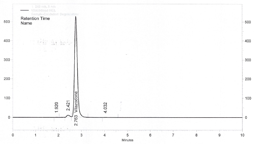 Vilazodone Hydrochloride was subjected to forced degradation under Acidic, Alkaline, Oxidation, Dry Heat and Photolytic degradation conditions. Vilazodone hydrochloride showed 3.12% degradation under acidic condition, 4.78% under alkaline condition, 7.8% under oxidation condition, 3.53% under dry heat condition and 4.9% under photolytic condition.