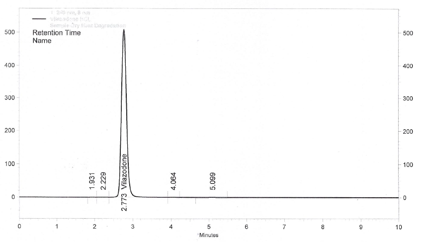 After exposing the drug powder to dry heat at 100 °C for 6 h, the percentage degradation of Vilazodone Hydrochloride in Dry Heat condition was found to be 3.53%.