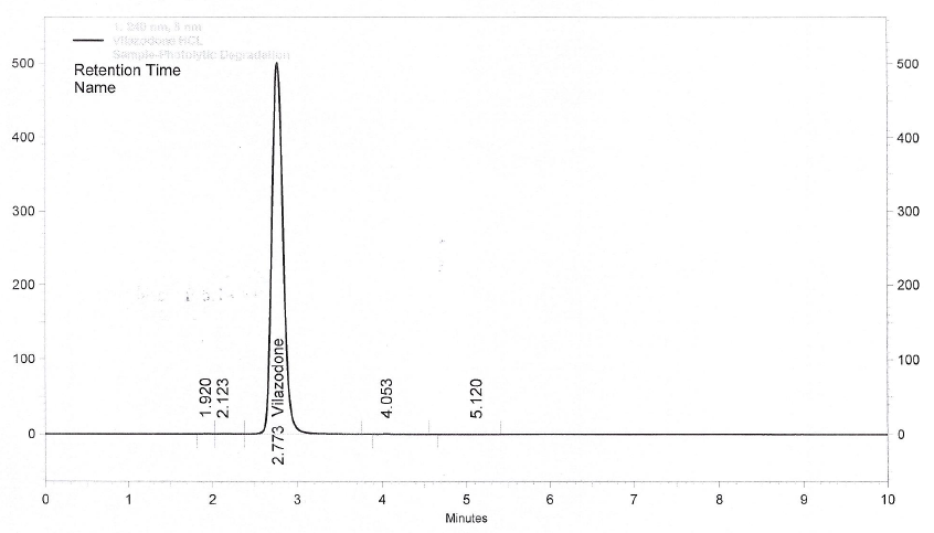 After exposing the drug powder to direct sunlight in petri dish covered with lid, the percentage degradation of Vilazodone Hydrochloride in Photolytic condition was found to be 4.9%.