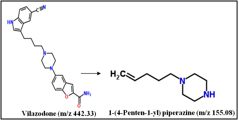 The base ion peak at retention time 3.44 min was m/z 442.33. The probable acid degradant with retention time 3.03 min showed base ion peak at m/z 155.08. Acid degradation impurity was identified and characterised by LC-MS/MS was found to be 1-(4-Penten-1-yl) piperazine having Molecular Weight 154.253 (m/z 155.08) and molecular formula C9H18N2.