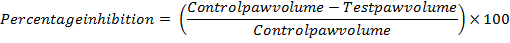 M. zapota leaf extracts for 10 d and the fourth group received diclofenac sodium as a standard (10 milligram/kilogram body weight). The paw volume was measured plethysommetrically (UgoBasile, Italy) at 0h, 1h, 2h, 3h, 4h, and 5h after the injection of carrageenan. The percentage of inhibition of paw volume of treated groups was calculated by comparing with a mean paw volume of the control group.