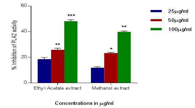 M. zapota ethyl acetate and methanol leaf extracts on PLA2 activity in vitro