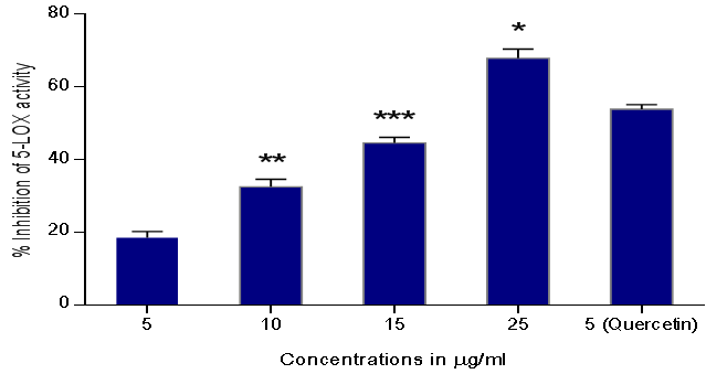 Fig. 2: Inhibitory effect of ethyl acetate leaf extract of Manilkara zapota on 5-LOX activity, Values are expressed as mean±SEM* P<0.05, ** P<0.01, *** P<0.001 represents significant difference compared with control group by student’s t-test (n=3)